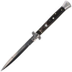 Frank Beltrame Stiletto Imit. Horn Bayonet 28cm. Cult Italian spring knife hand-folded linings imitating buffalo horn. Folder when opening the hundredths of a second blade emits a characteristic click that distinguishes it from other spring knives