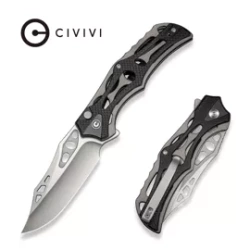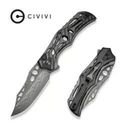 Biophase Gray Aluminum / Carbon Fiber / Black G10, Damascus large all-purpose folding knife with avant-garde styling. Stainless damascus head, skeletonized aluminum and scales from carbon fiber overlay on black G10. Extremely secure grip!