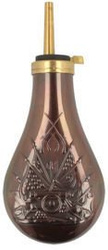DP529-44, Davide Pedersoli powder flask with a dispenser. Designed for .44 caliber Remington black powder revolvers. Powder charge: 24 grains. Made of lacquered copper with a hunting motif and a brass dispenser.