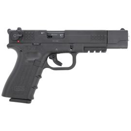 111002 ISSC M22 TGT GEN 2 Black side-firing pistol for practical or sports training with compenstor-loader. Adjustable targeting instruments, 10-round magazine, SA trigger mechanism. Skeleton design similar to the Glock pistol...
