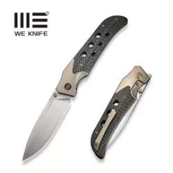 WE-Guthrie Champagne Titanium/Twill Carbon Fiber, Hand Rubbed Satin, duży nóż składany EDC, zaprojektowany przez Jasona Guthrie. Wygodna rękojeść z tytanowymi bolsterami i włóknem węglowym, utylitarna głownia ze stali CPM 20CV, mocna konstrukcja.