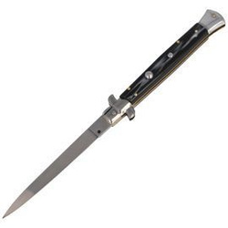 Frank Beltrame Stiletto Dagger White Pearl 23 cm. Ręcznie składany według zasad włoskiego rzemiosła, tradycyjny włoski nóż sprężynowy. Folder podczas otwierania klingi wydaję charakterystyczny dźwięk klik odróżniający go od pozostałych noży sprężynowych..