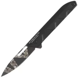 Ferrum T Black Warfare Aluminium, Geotech Camo mocno zbudowany nóż składany firmy Extrema Ratio. Sprawdzone rozwiązania ER, profilowana rękojeść z antykorodowego aluminium, sprawdzona stal N690 na głownię noża, łożyska kulkowe dla gładkiego otwierania!