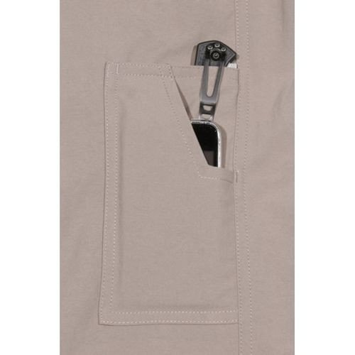 • Very deep front pockets with angled entrances can accommodate a lot of small items. The right pocket has an inside pocket, which prevents the movement of hard objects inside the pocket while protecting the main pocket against abrasion. The lower edge of the pocket entrance has been cut flat so that you can carry knives, flashlights or other items with a clip, allowing you to conveniently fit it in your pocket.