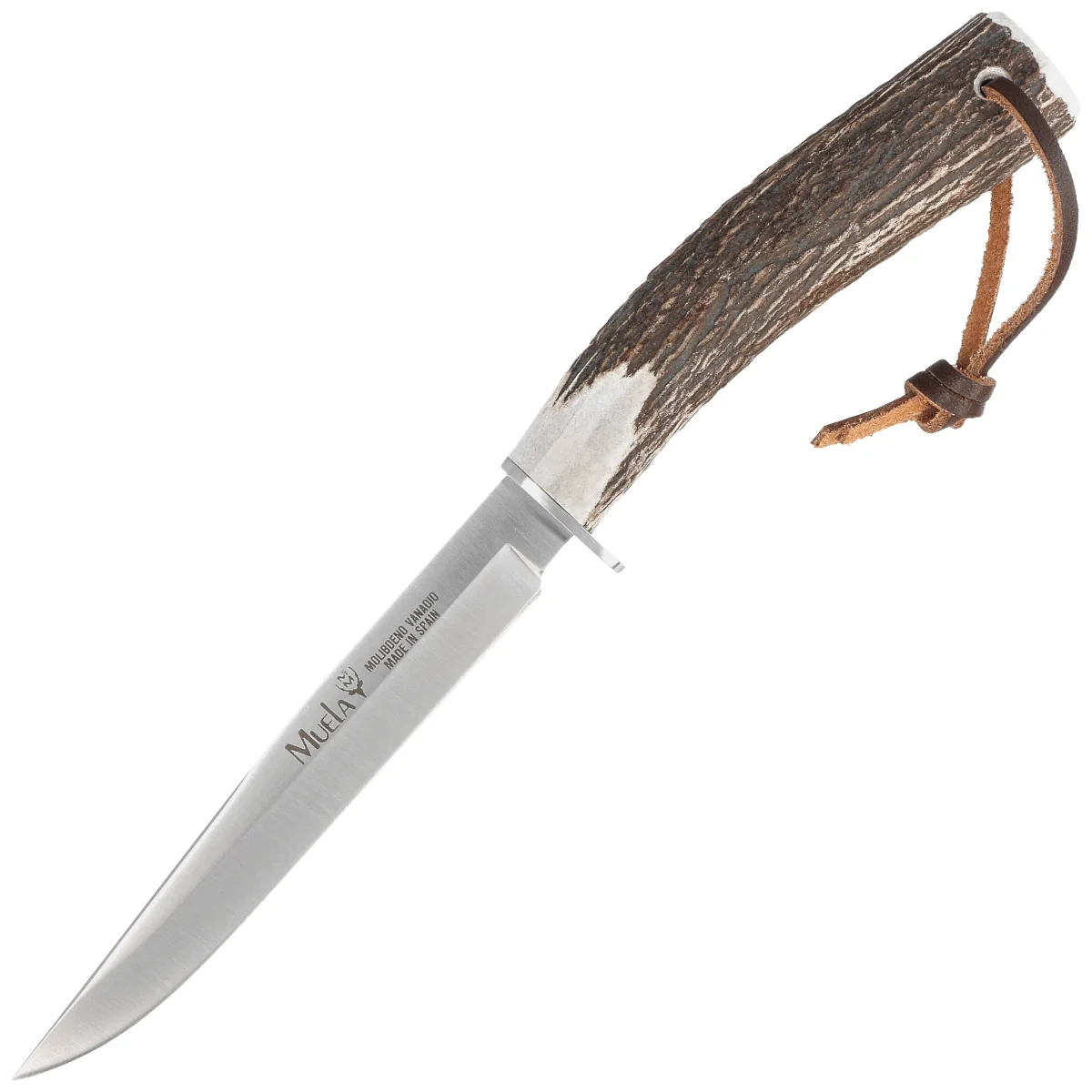 - Gredos 14 is a hunting knife. The blade was covered non-reflective (Satin Finish) coat. Handles cladding from deer antler. Double-sided steel. Leather case sewn on the edges with decorative thread with embossed logo Spanish Muela Company.