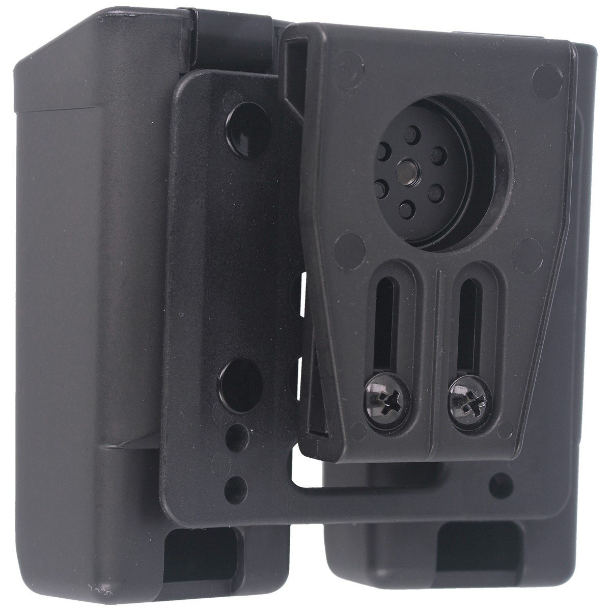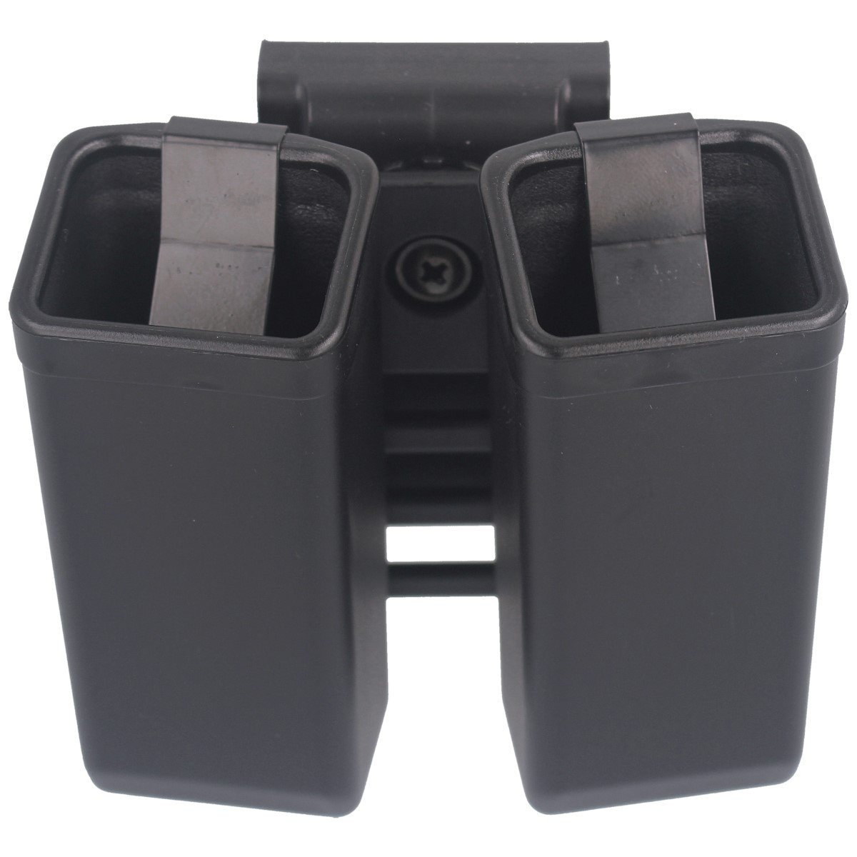 Polymer open-type loaders for 2 double-row magazines cal. 9mm/.40/.45 with belt anchor type UBC-03 in black by the Czech company ESP. Internal spring holds magazine, allows for quick withdrawal. Fits m.in. Glock, Walther P99, H&K 9mm/.40, Beretta 92/96/M9, Springfield XD, Ruger, Browning HP, SIG Sauer P226/P229, S&W MP9, CZ 75 Compact, Taurus 92/99.