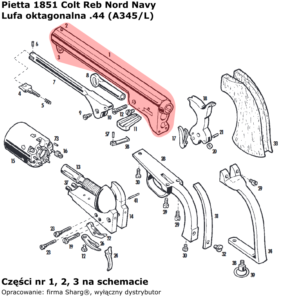 • A345/L (service) oxidised on black color, octagonal 12 inch barrel from Pietta Company. For blackpowder revolver 1851 REB Nord Navy Carbine .44 cal.