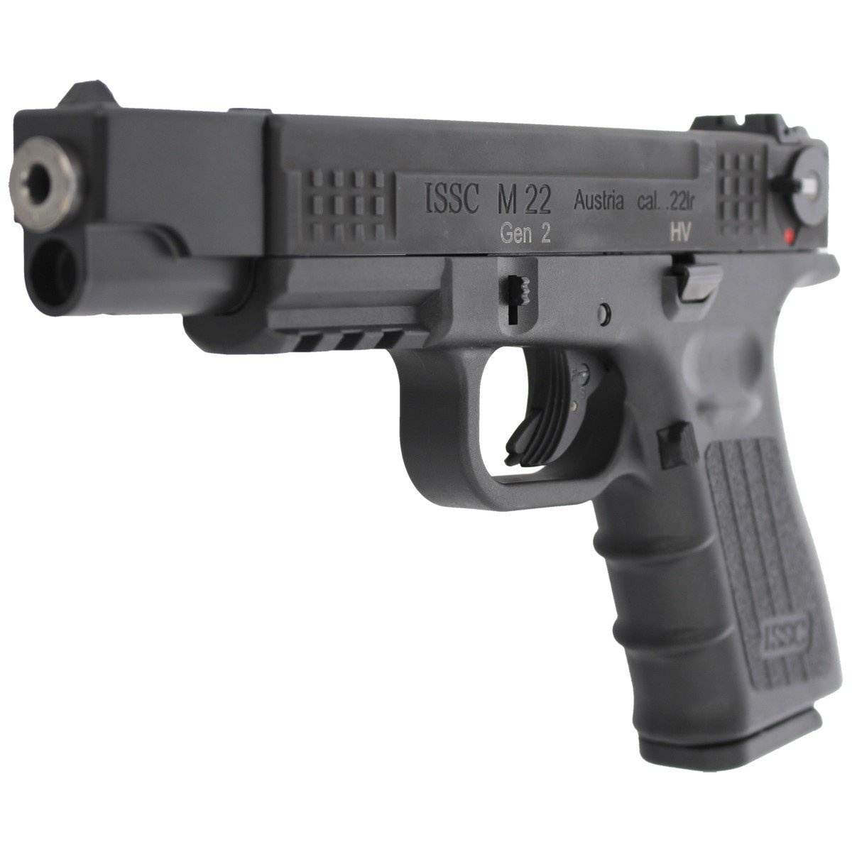 - 111002 ISSC M22 TGT GEN 2 Black side-firing pistol for practical or sports training with compenstor-loader. Adjustable targeting instruments, 10-round magazine, SA trigger mechanism. Skeleton design similar to the Glock pistol...