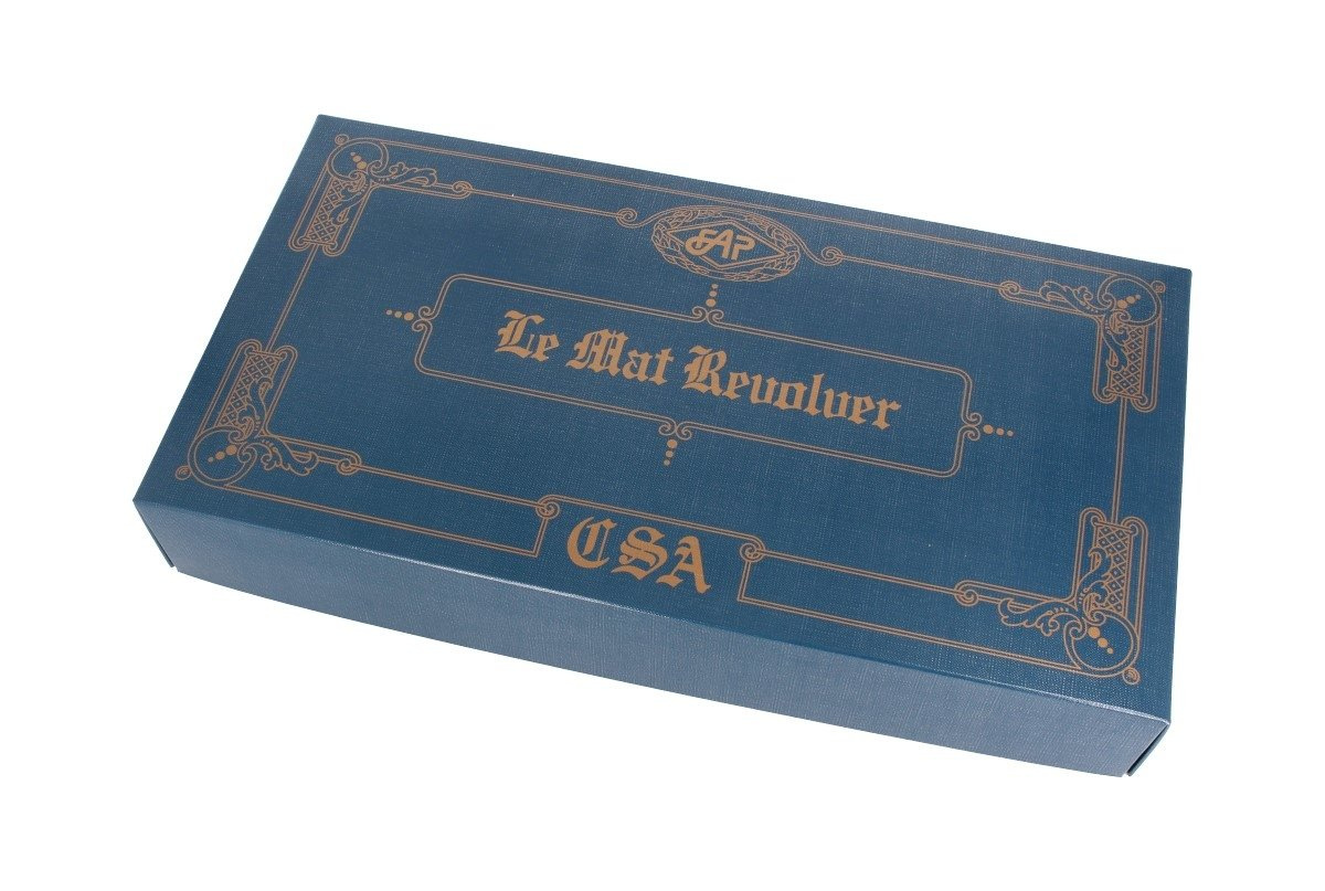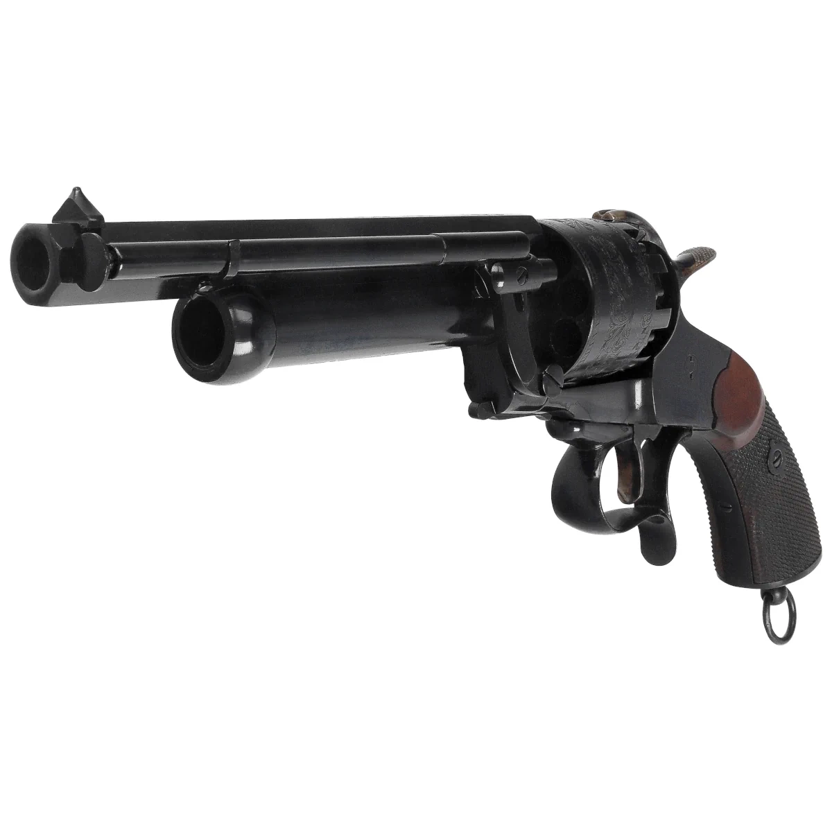 This is a muzzle-loading, percussion cap black powder revolver. It was patented in 1856 in the United States by French firearms designer and aristocrat Jean François Le Mat. The Cavalry version features a spur trigger guard for improved grip, a lever-secured barrel attachment to the frame, and a lanyard ring for secure retention.