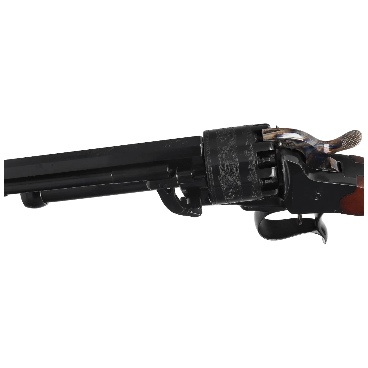 Cylinder – 9-shot, front-loaded. Decorated with an engraved floral motif. Black blued finish.