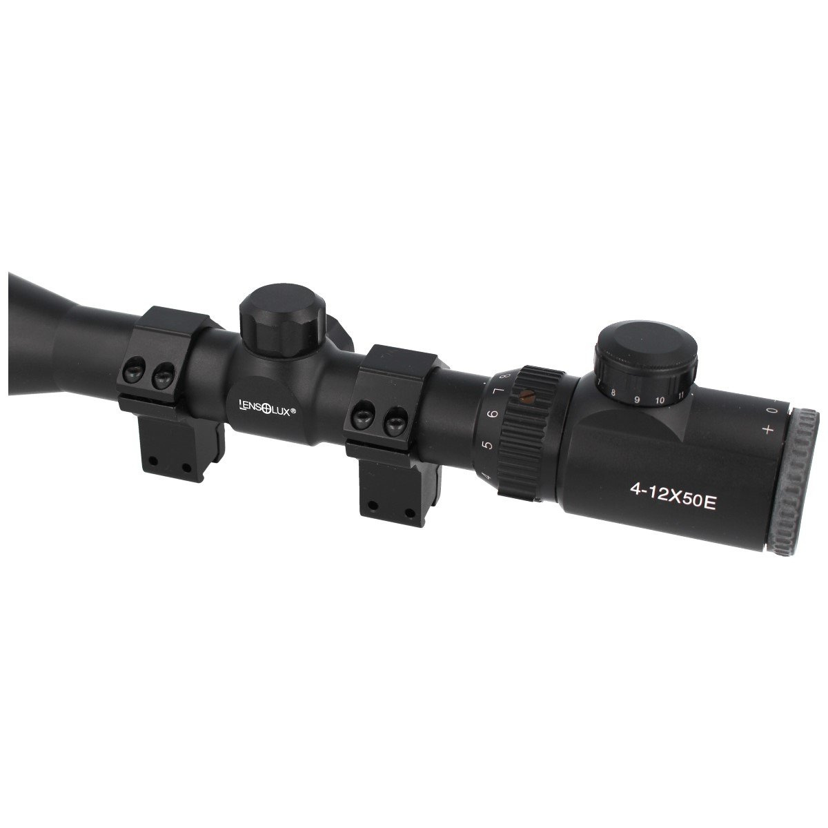 - 19435 a new generation rifle scope with illuminated 4 Red-Dot crosshair by Lensolux. Variable magnification 3-12x, lens diameter 50mm. Viewfinder with excellent twilight performance and for aiming at smaller targets at longer distances