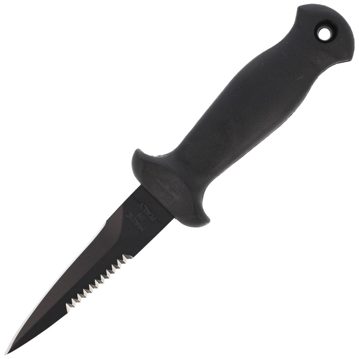 SUB 9 STILETTO BLACK 2 compact diver's knife (back-up) of full tang construction with a fixed blade coated in matte black Manufactured by the Italian company MAC Coltellerie. Suitable for use during diving expeditions and on land.