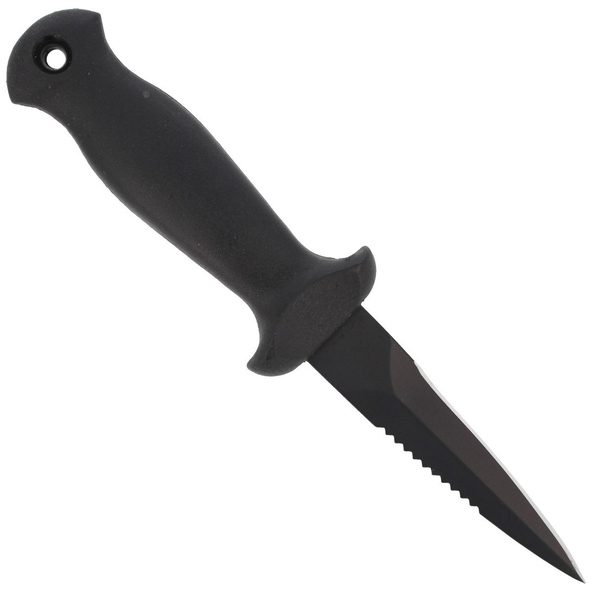 Blade - with Dagger (dagger) profile, both sides with excellent cutting properties were derived with Flat Grind. One of the blades fully smooth Plain, the other serrated Serrated ending on the side of the tip with a few millimeters of smooth blade. The Serrated blade is used in diving, rescue and survival knives, ideal for aggressive cutting of hard materials, plastics and fibrous materials such as ropes and nets. The blade is coated with a matte, scratch-resistant non-reflective IDROGLIDER GOLD® Black coating.