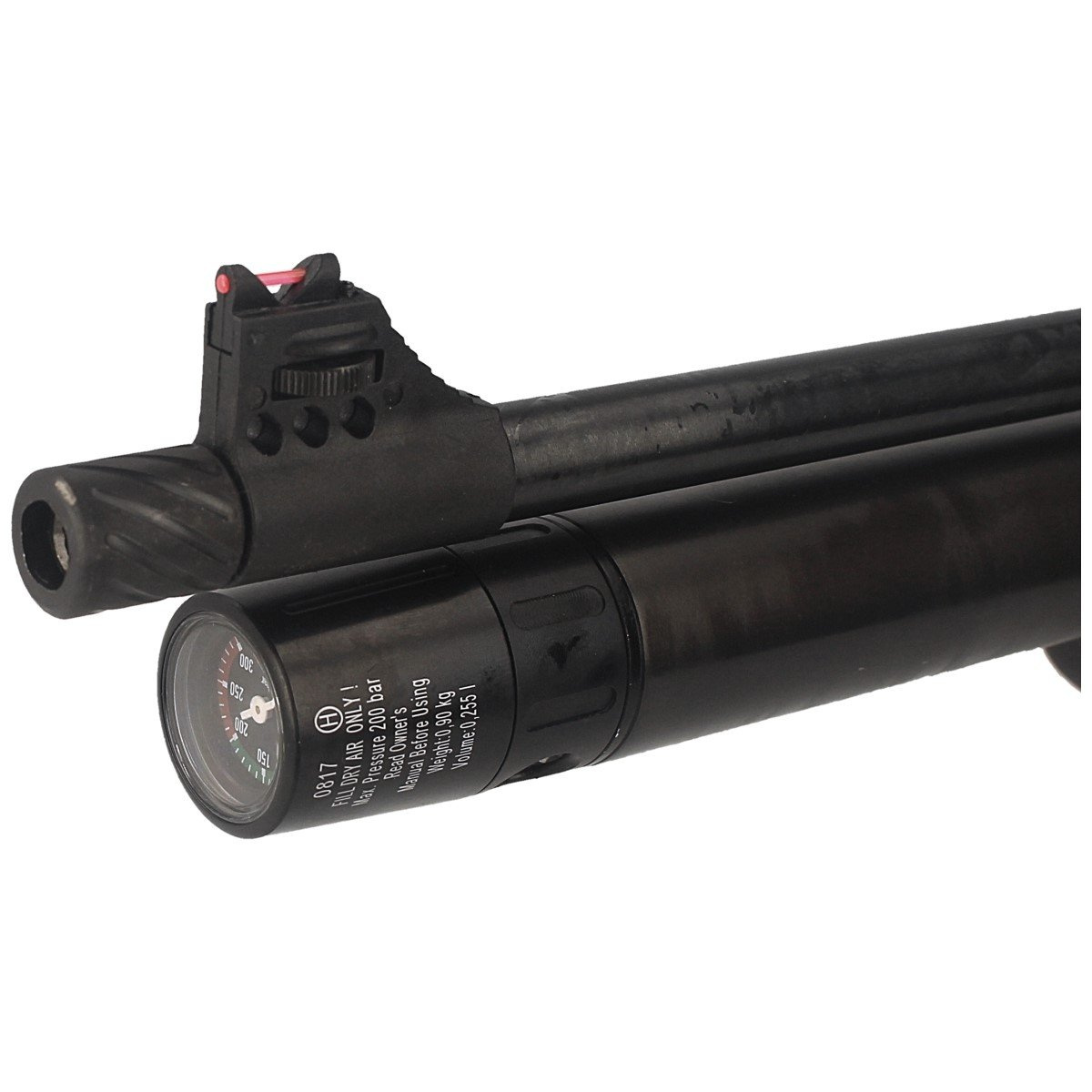 Power supply - replaceable compressed air tank with a capacity of 255 cc. A fully charged cartridge allows you to fire a 19 effective shots (data for versions FAC*). Built-in pressure gauge allows you to control the pressure present in the tank, and thus the degree of its charge. A rotating ring protects the charging inlet from damage. After the compressed air is emptied, the empty tank can be replaced by a new filled one (optional). This provides an excellent solution for those not intending to take the PCP pumps or cylinders range. 130 bar minimum working pressure in the cartridge necessary for proper operation of the windcheater Carnivore.