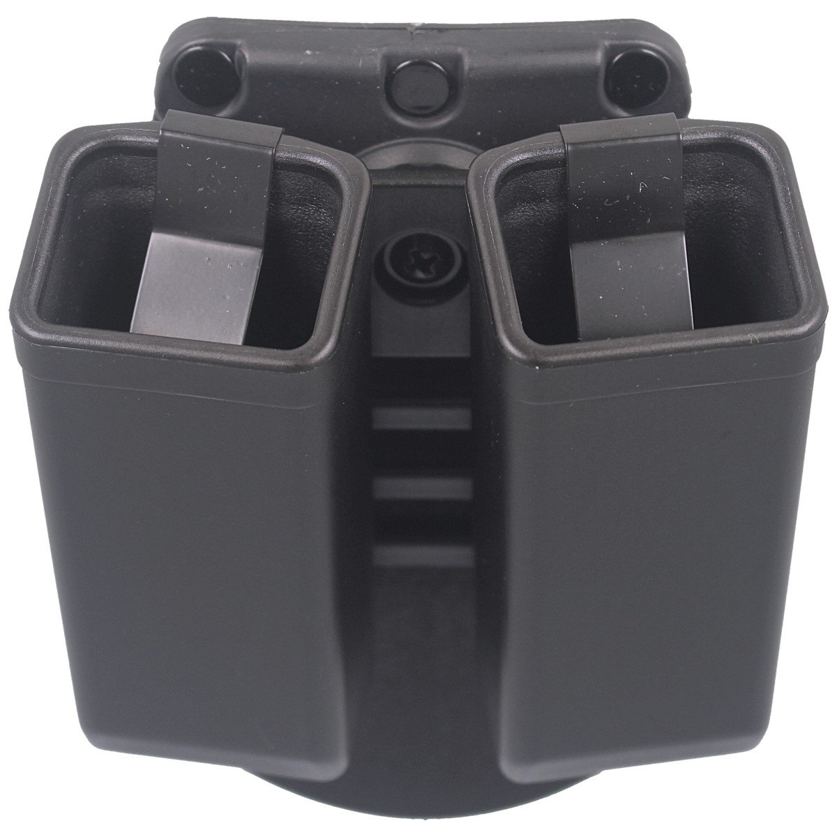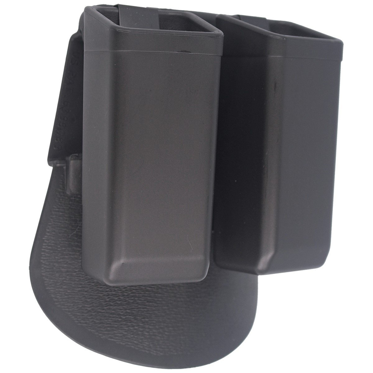 Open-type polymer pouch for two 9mm / .40 / .45 double-row magazines with Paddle  Fobus belt attachment in black color from the Czech company ESP. The internal spring holds the magazine and allows it to be removed quickly. It fits, among others Glock, Walther P99, H&K 9mm / .40, Beretta 92/96 / M9, Springfield XD, Ruger, Browning HP, SIG Sauer P226 / P229, S&W MP9, CZ 75 Compact, Taurus 92/99.