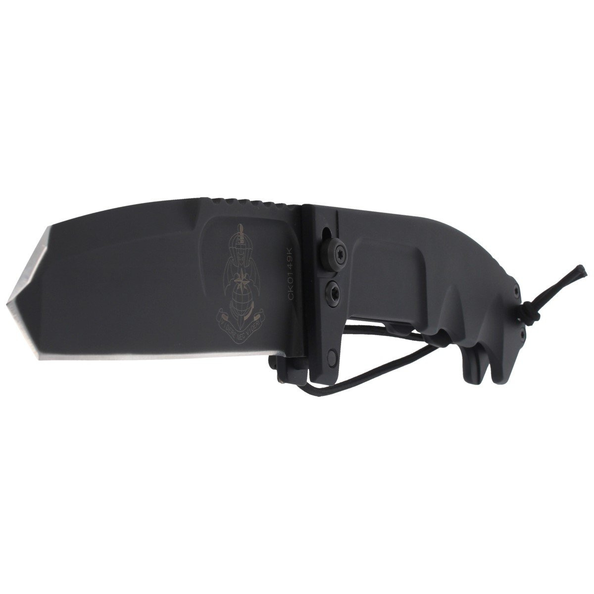 Blade - a solid 6 mm thick and extremely sharp, with a short false edge and Tanto shape, providing excellent cutting edge geometry with low friction. The blade is coated with a non-reflective matte MIL-C-13924 BURNISHING finish. The smooth Plain edge features a flat grind. A long jimped thumb ramp on the spine (spine jimping) enhances control and ease of knife handling.