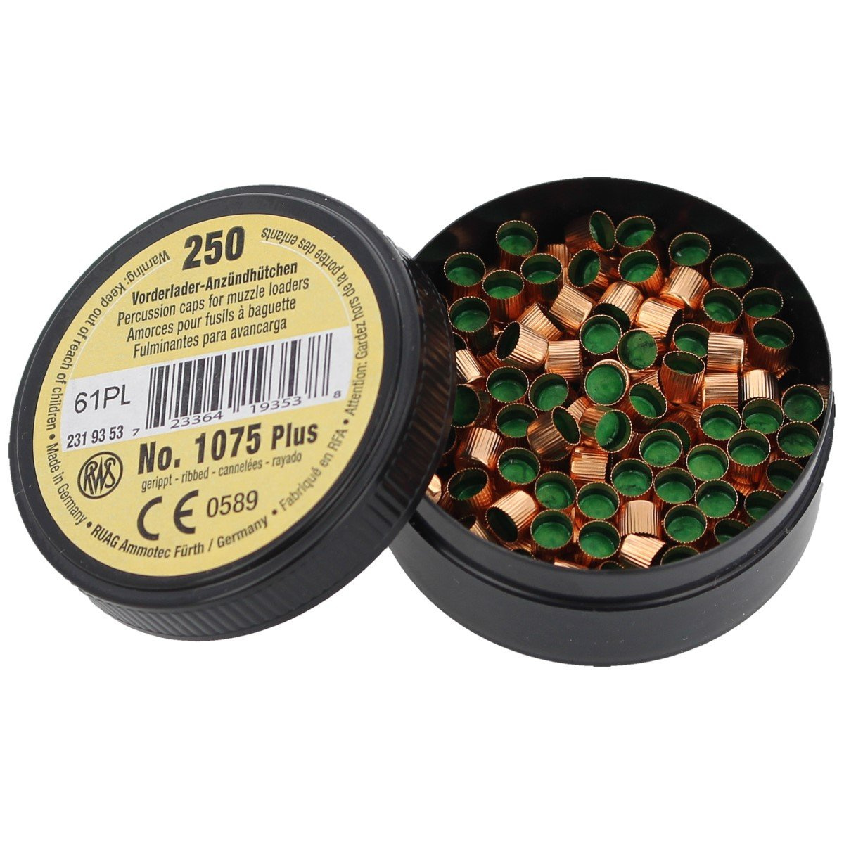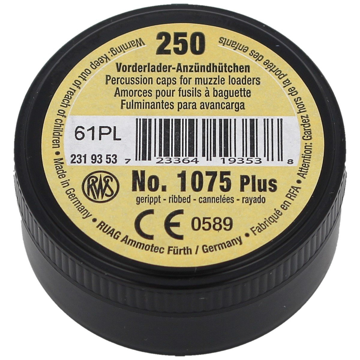- Excellent fireplace caps with reinforced charge from German brand RWS No. 1075 PLUS (4 mm). Large pack of 250 pcs. Designed for black-rifle weapons: revolvers m.in. pietta company (Colt Navy, Remington, Peacemaker) and pistols and rifles.