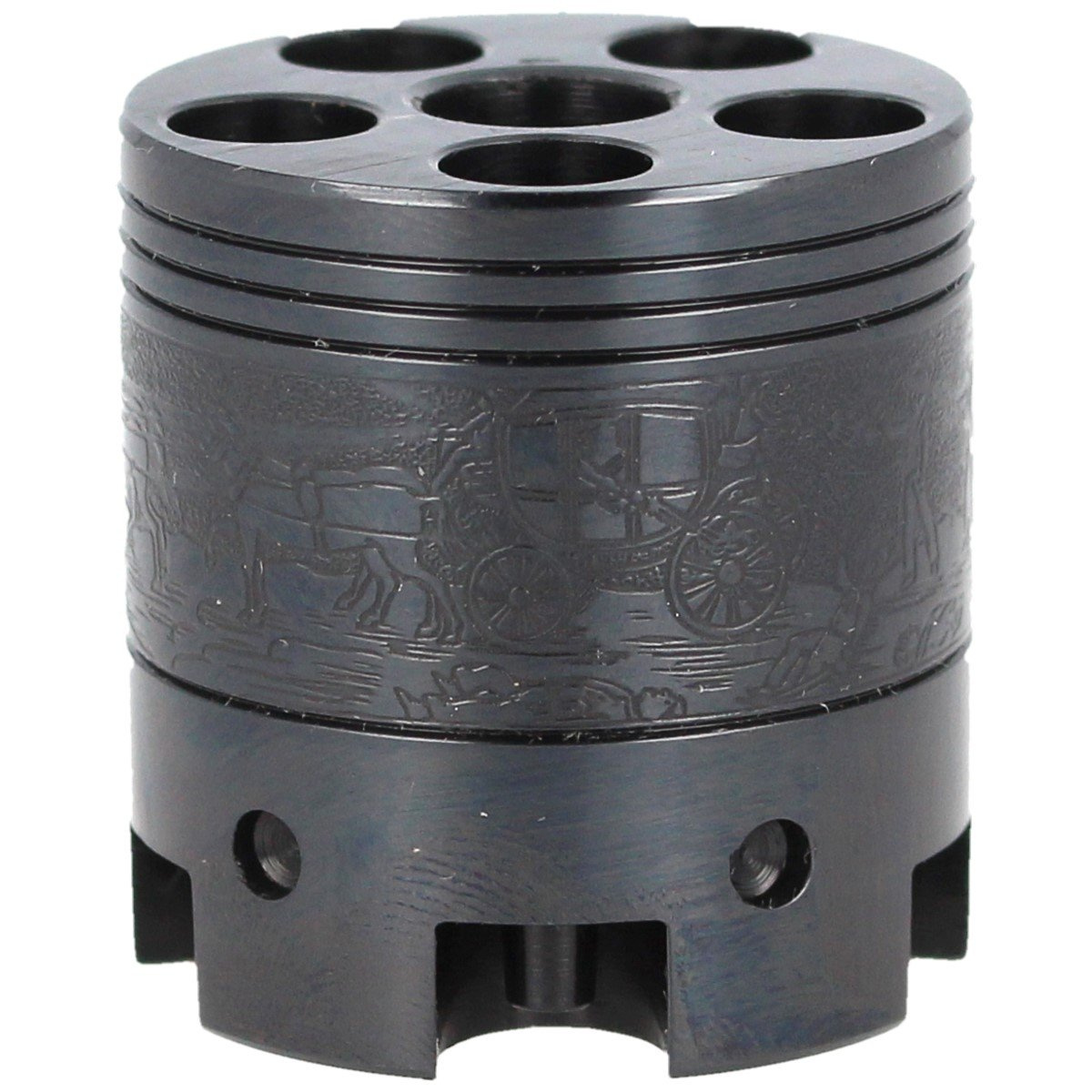 A2092 5-chamber full percussion cylinder (#9 in the diagram) by Pietta with a set of cylinders (#10). Black oxidized with a stagecoach scene engraved on the drum cylinder. Intended for the 1836 Colt Paterson Texas black powder revolver in the .36 caliber.