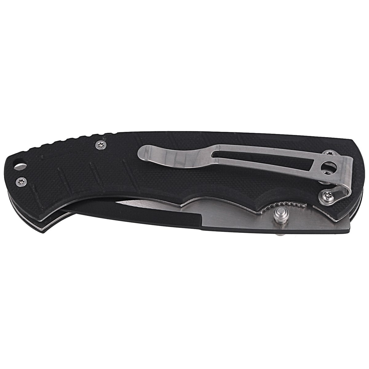 Handle - black G10 plastic facings (fiberglass compressed with synthetic resin) mounted to a steel frame. Twisted together by means of a spacer. This construction makes the knife lightweight while maintaining high strength. Chamfered cover edges eliminate sharp edges for a comfortable and secure grip. The single-position (right) metal deep carry clip allows you to carry the knife discreetly in your pocket in the tip-down position. The back of the handle features a Lanyard Hole, a hole for mounting a safety or decorative cord.