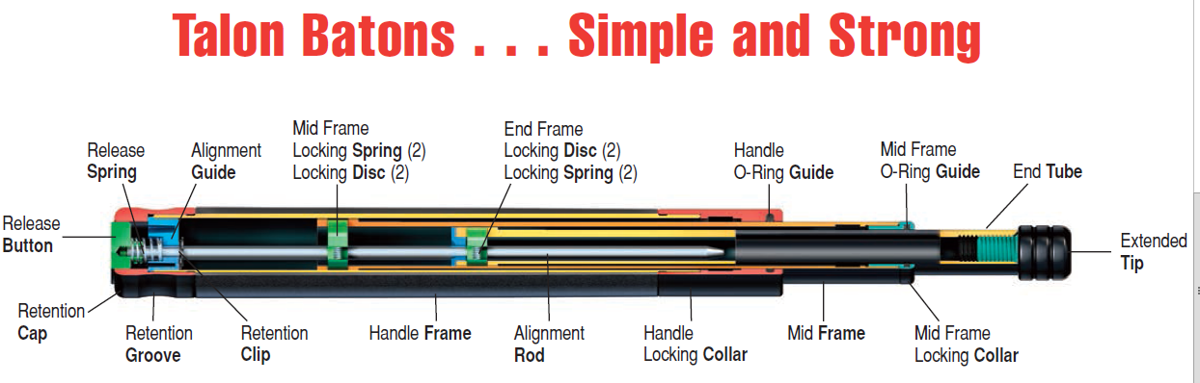 • Talon Infinity Baton Disc Loc Button (T60KB) hardened telescopic truncheon Disc Loc 60cm (23") long. Matte coated Black Chrome, Foam handle, Button Release button. TALON stick can be opened twice as standard or by pulling the tip of the bar..