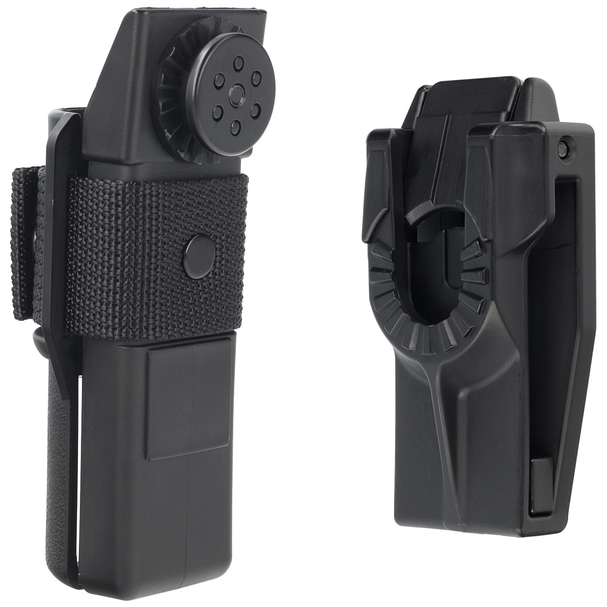 UBC-05 - (Quick Change System) universal belt attachment retractable. Allows for quick replacement baton holder for another with a rotating mechanism. The attachment remains on the belt - you just need to choose another holster and attach it. Thanks to the highly flexible system, the user has the ability to swap the equipment for whatever he or she needs at the moment. Telescopic baton holster, can be exchanged for magazine loader or flashlight case. Mounting UBC-05 fits most belt widths 32-50 mm, and after removing the adjustment from the handle even up to 60 mm (police belt / duty belt). In order to prevent the equipment from moving on the belt, for example, while running, the mount is equipped with two adjustment screws, with which we lock the mount in the required place on the belt.