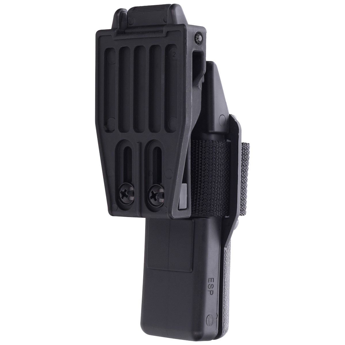 UBC-05 - slip on belt transport mount with system Quick Change. Allows the user to quickly swap holsters, loaders or handle by means of its unplugging z attachment clip, then pinning for this place of another holsters, loaders be handle companies ESP with swivel mechanism. Thanks to the flexibility of the system, the user has the ability to swap equipment as needed at any given time, without having to remove the belt. Telescopic baton holster, can be replaced with magazine loader or flashlight holder. UBC-05 fits on a belt width from 32 mm to 60 mm including the police lane. In order to avoid shifting of the brace, for example, while running, attachment clip is equipped with two adjustment screws, with which we lock the equipment in the required place on the belt. UBC-05 allows rotation of a full 360 degrees and stepless angle settings pinned equipment in one of 16 defined positions without using any tools.