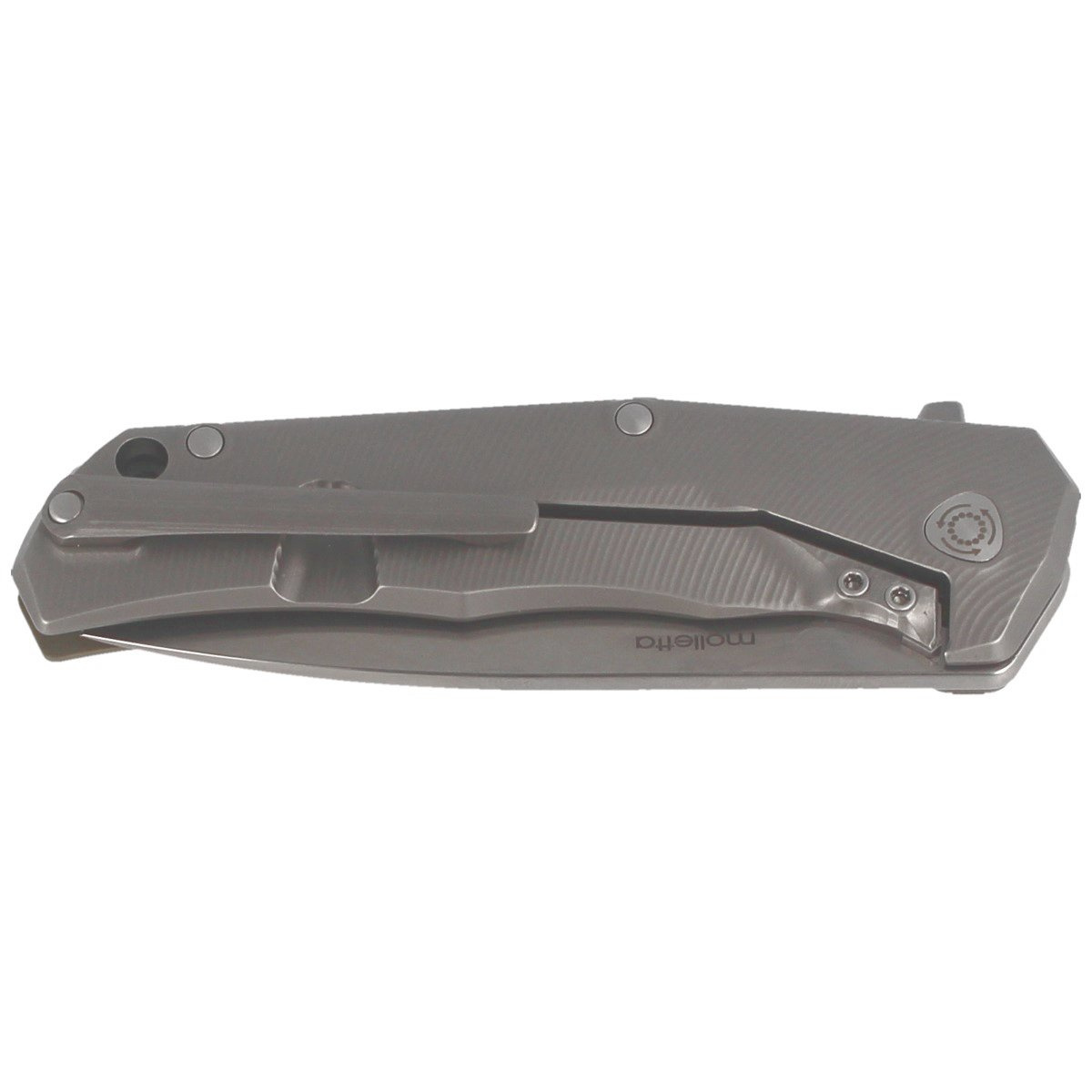 Head - Drop Point finished with a scratch-masking, non-reflective coating Stone Washed. Smooth blade Plain brought out flat grind (Flat Grind). Frame-Lock reinforced, monolithic locking mechanism of the wedge made of 6AI4V titanium, one of the grip facings acts as a locking mechanism. Located on the underside of the head projection / flipper, supported by IKBS facilitates the opening of the wedge. In the open position it serves as a lower guard one-sided hilt protects the hand from slipping off the handle.