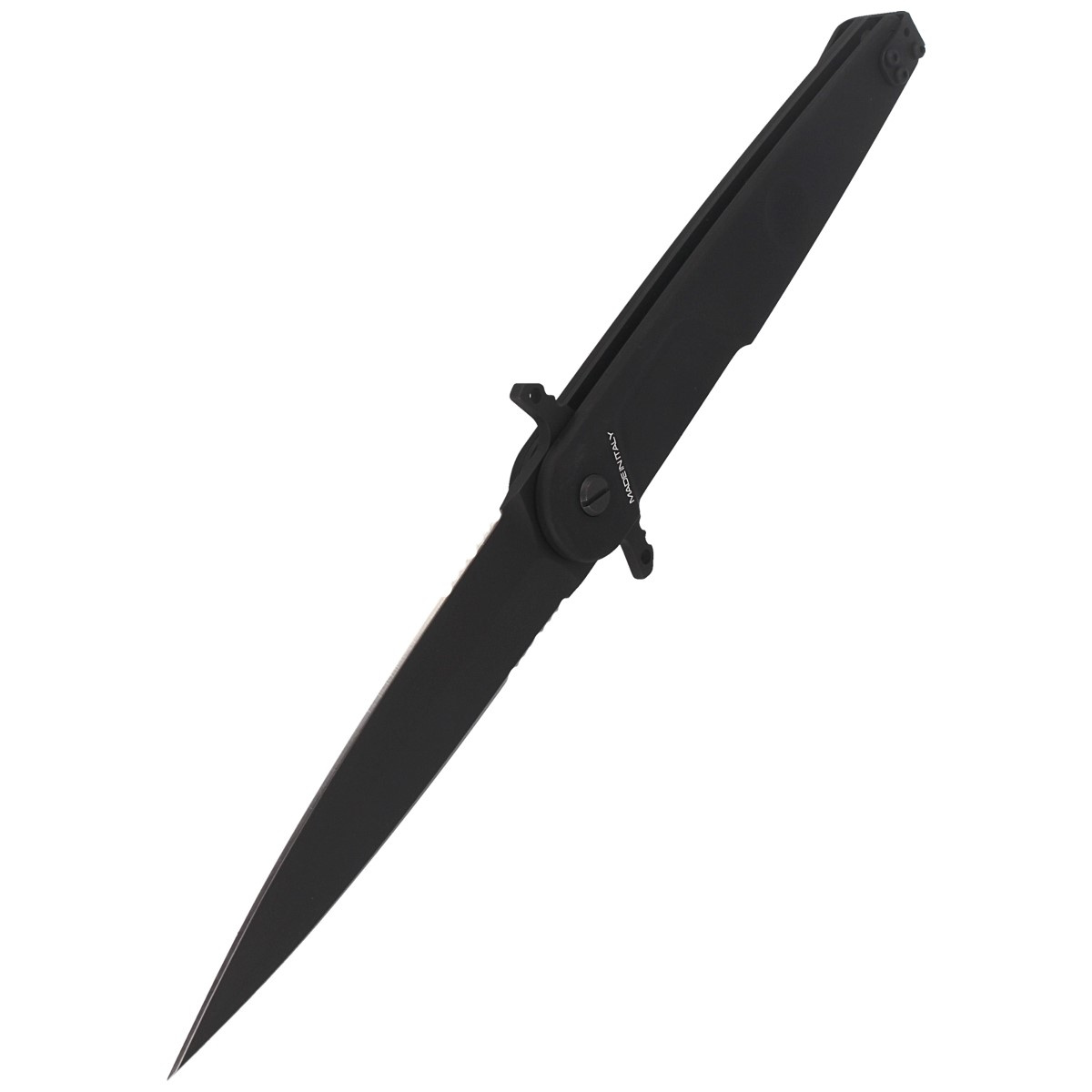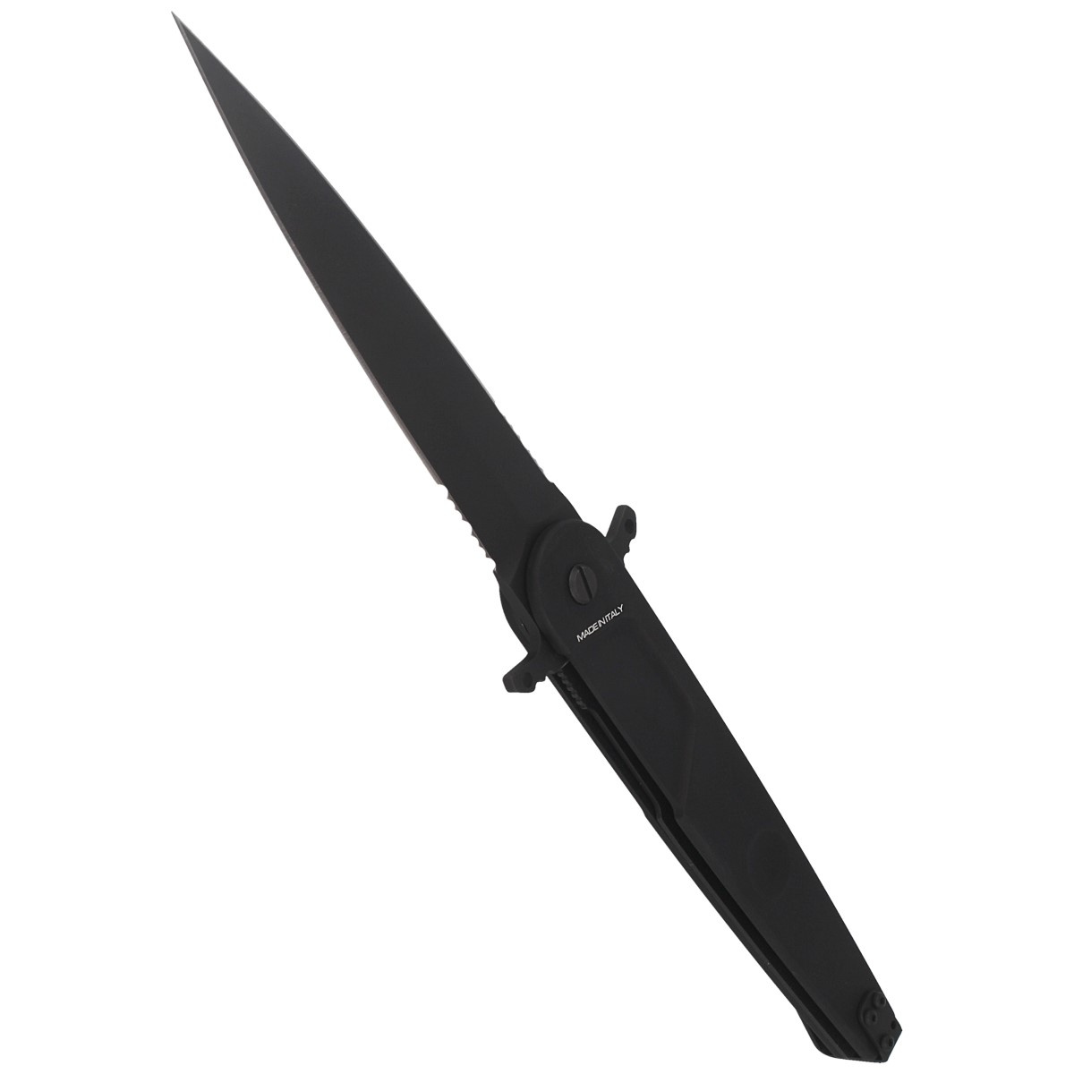 Blade - slim and extremely sharp, 3 mm thickness with Dagger profile with a double-edged symmetrical blade. Blade sides equipped with a short saw for aggressive cutting. The blade is made of well-sharpening, produced in the Austrian steel mill Böhler-Uddeholm, durable, high-cobalt stainless steel N690 with a hardness of 58 HRC. Covered with a matt non-reflective coating MIL-C-13924 BURNISHING. The double-sided smooth blade (Plain type) was made with flat cut (Flat Grind) which provides strength, excellent cutting edge geometry and extreme cutting and penetration performance. Robust blade blockade: Liner-Lock type mechanism.