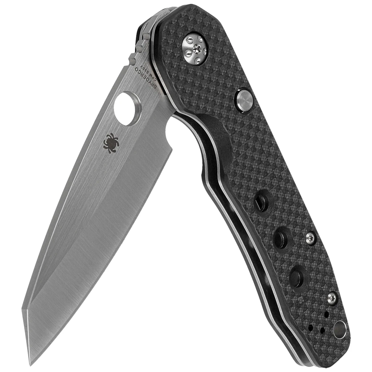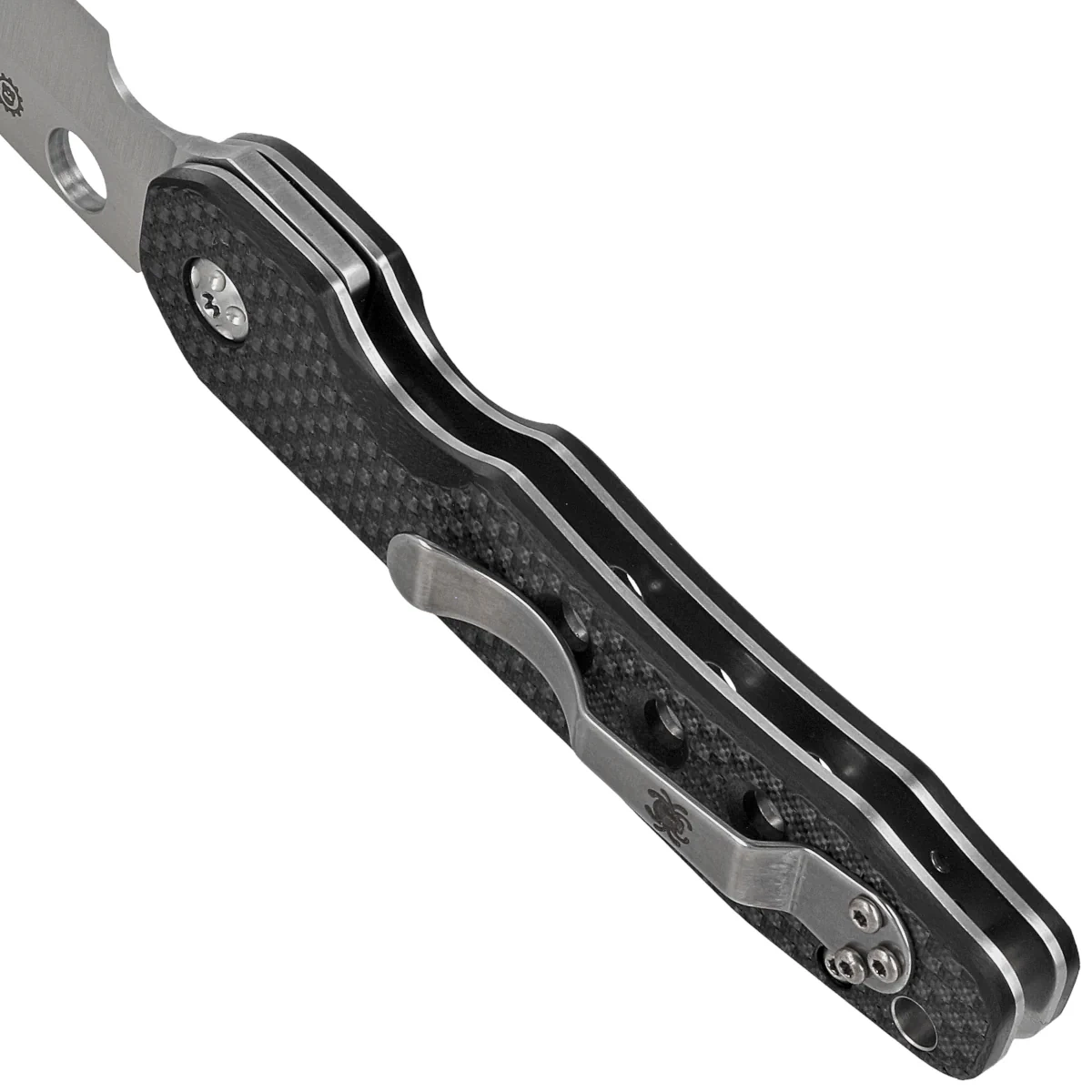 Handle - laminated claddings made of textured carbon fiber / G-10. G-10 material - resistant to high and low temperatures, chemicals) provides a comfortable grip, ergonomic streamlined shape and exclusive texture. The cut in one of the cladding guarantees intuitive access to the SpyderHole cutout. The metal one-position clip (right-handed) allows you to carry the knife in the tip-up position. In the rear part of the linings was placed a gap (lanyard hole) enabling fixing the rope.