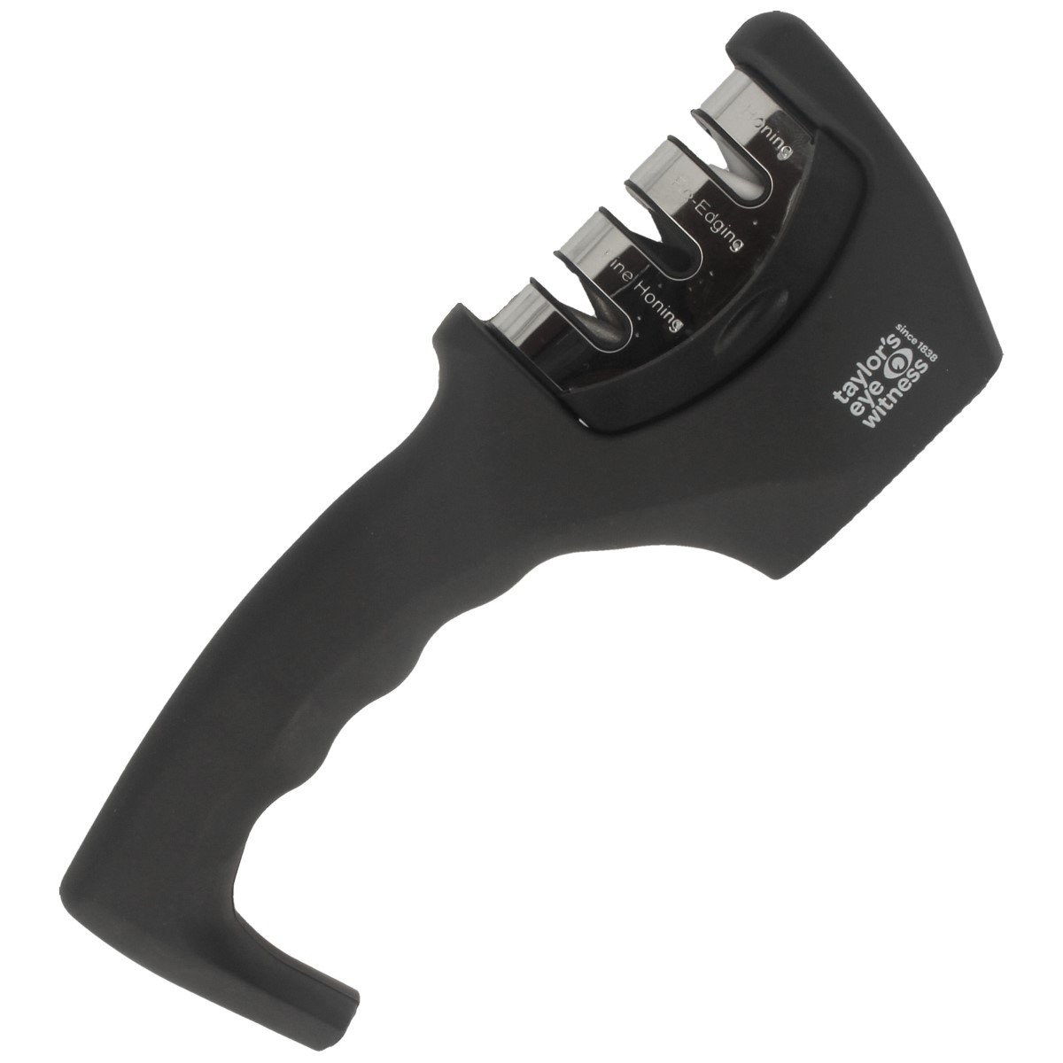 - T5D063 Taylor's Eye Witness knife sharpener. Three surfaces with different gradations allow for quick derivation of cutting edges. Tungsten carbide to give focus. Ceramic rods for sharpening and smoothing. Synthetic diamond for finishing.