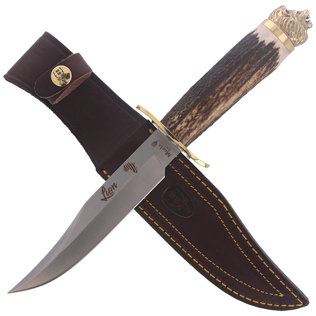 - LION-16BF a unique Muela knife. High quality of used materials, careful finishing of details. A knife for collectors, hunting enthusiasts. Deer antler handle, finished with a medallion with a hunting motif, lion's head. Gift box. Pouch Leather.