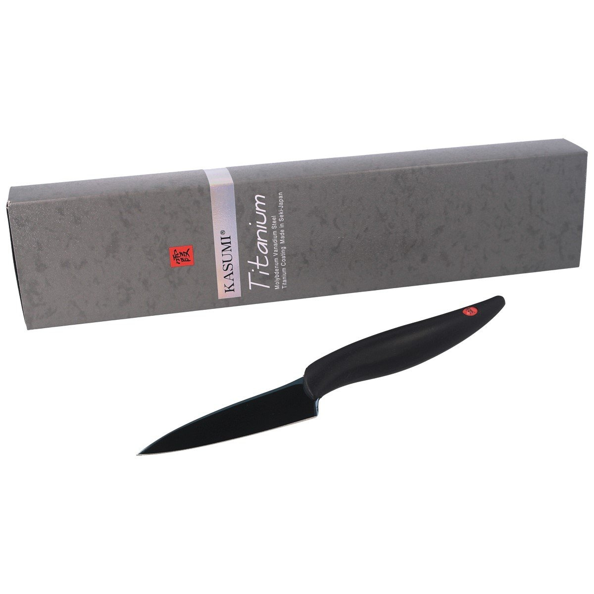 - Kasumi Blue Titanium Paring is made of Molybdenum-vanadium stainless steel, coated with a blue titanium coating. It gives the blade super abrasion resistance. Titanium is also inert, so it prevents giving food a metallic aftertaste. Note!!! Very sharp!!!