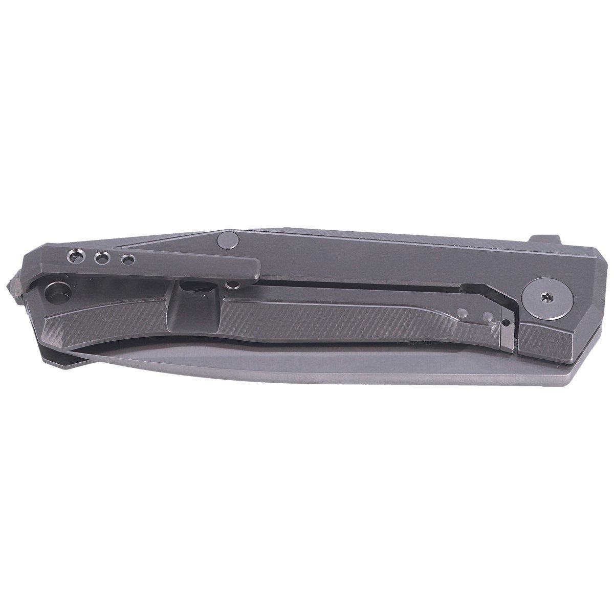 Blade - Drop Point finished in an elegant Satin method. Plain blade derived with Flat Grind which gives excellent cutting edge geometry and extreme cutting performance. Frame-Lock reinforced monolithic 6AI4V titanium blade lock, one of the grip linings acts as a locking mechanism. Located on the underside of the blade, the protrusion / flipper, supported by the Double Crown ball bearing system, facilitates the opening of the blade. In the open position, it serves as a lower guard / hilt protecting the hand from slipping off the handle.