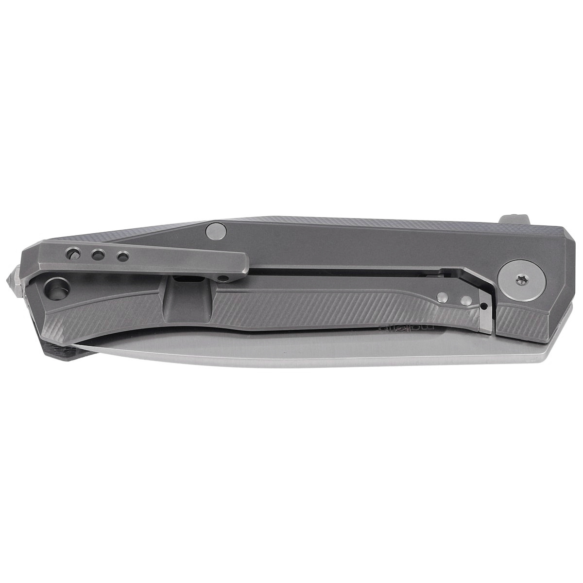 Handle - asymmetrical made of double milled solid titanium 6AI-4V, which is the base of the mechanism locking the blade and carbon fiber. The facings are attached to the titanium spacer backspacer / facings connector. The open-backed design reduces weight and simplifies cleaning. Solid® titanium clip allows knife to be carried in tip-up position. Bolted to titanium frame with tungsten carbide screw/glass breaker. In the back of the linings lanyard hole, a hole for a cord.