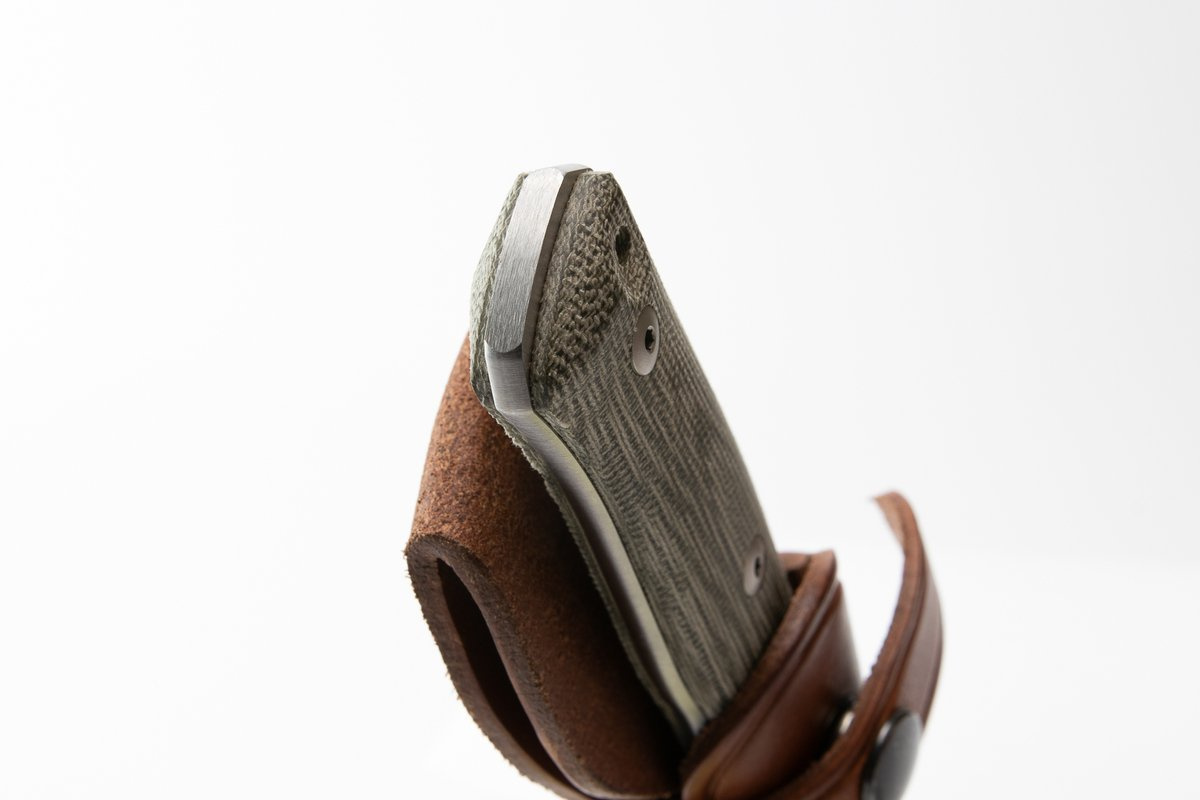 Handle - made of damage resistant Micarta Green Canvas. Milled facings with non-slip texture provide excellent grip. Sophisticated handle ergonomics allow the knife to be held either way with the thumb toward the blade or toward the end of the handle. Flat shank with lanyard hole, a hole for a rope, helpful for lighting a fire with a flint, can also be used as a hammer.