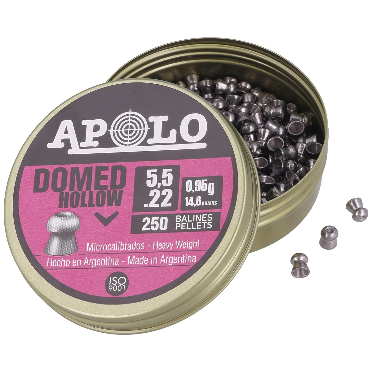 - Domed Hollow .22 heavy Apolo pellets in 5,5mm caliber with a flat trajectory for long-distance shooting at an excellent price! Ideal for target destruction and pest hunting. Lead alloy leaving negligible residue in the barrel. Pack of 250 pcs.