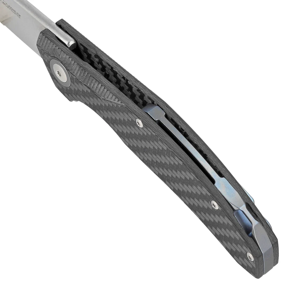 Robust Carbon Fiber facings (carbon fiber pressed under pressure with synthetic resin) screwed to the CNC milled titanium backspacer, which means practical indestructibility of such construction. The backspacer and the decorative ring around the pivot collar are made of blue anodized titanium. Right-side, one-position titanium deep carry clip allows you to carry the knife discreetly in tip-up position. Backspacer with lanyard hole, an elongated hole for a belay or decorative cord.