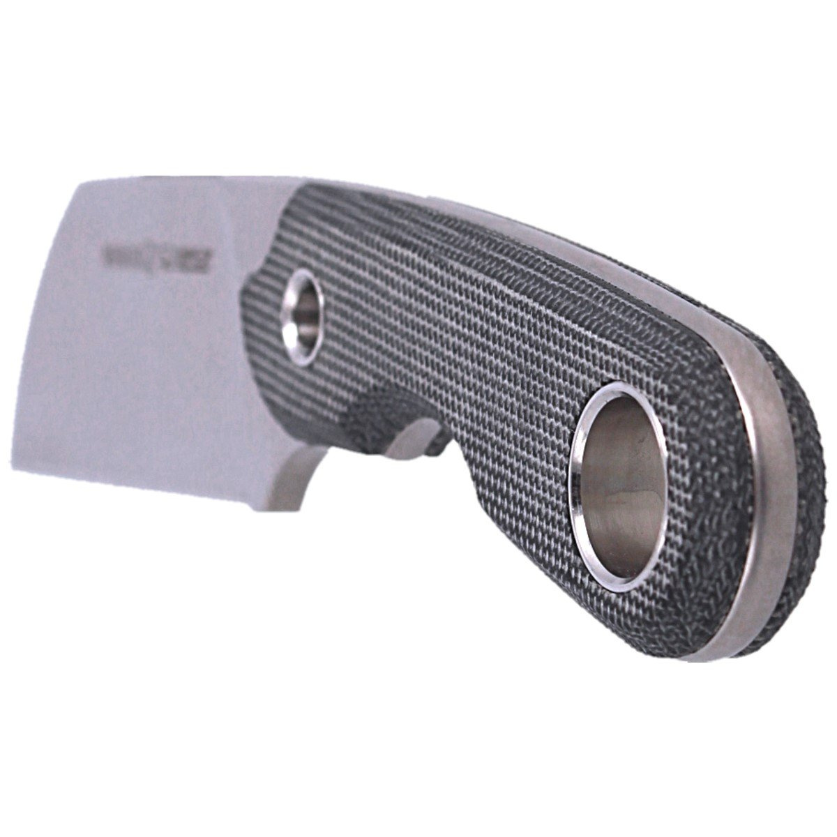Blade - type Sheepsfoot was finished with Stone Washed coating masking minor scratches. Small thickness of blade in combination with high, flat grind gives us an extremely effective cutting tool. Spine jimping, a notched support on the back of the blade and finger choil, an undercut for the index finger provides precise control of the cutting direction.