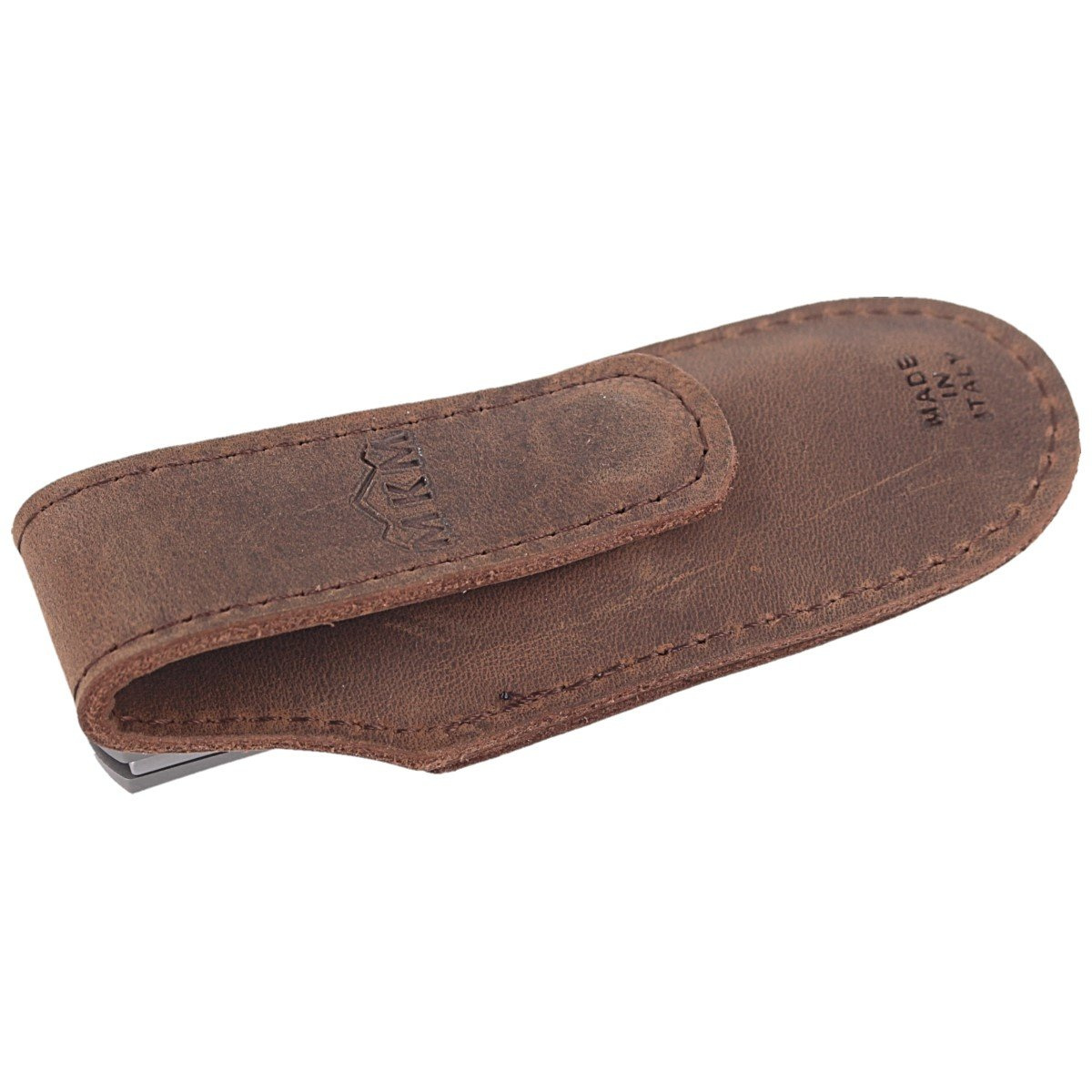 Scabbard - includes hand sewn pouch made of high quality buffalo leather with brand logo. Attached to the belt with a magnetic clasp.