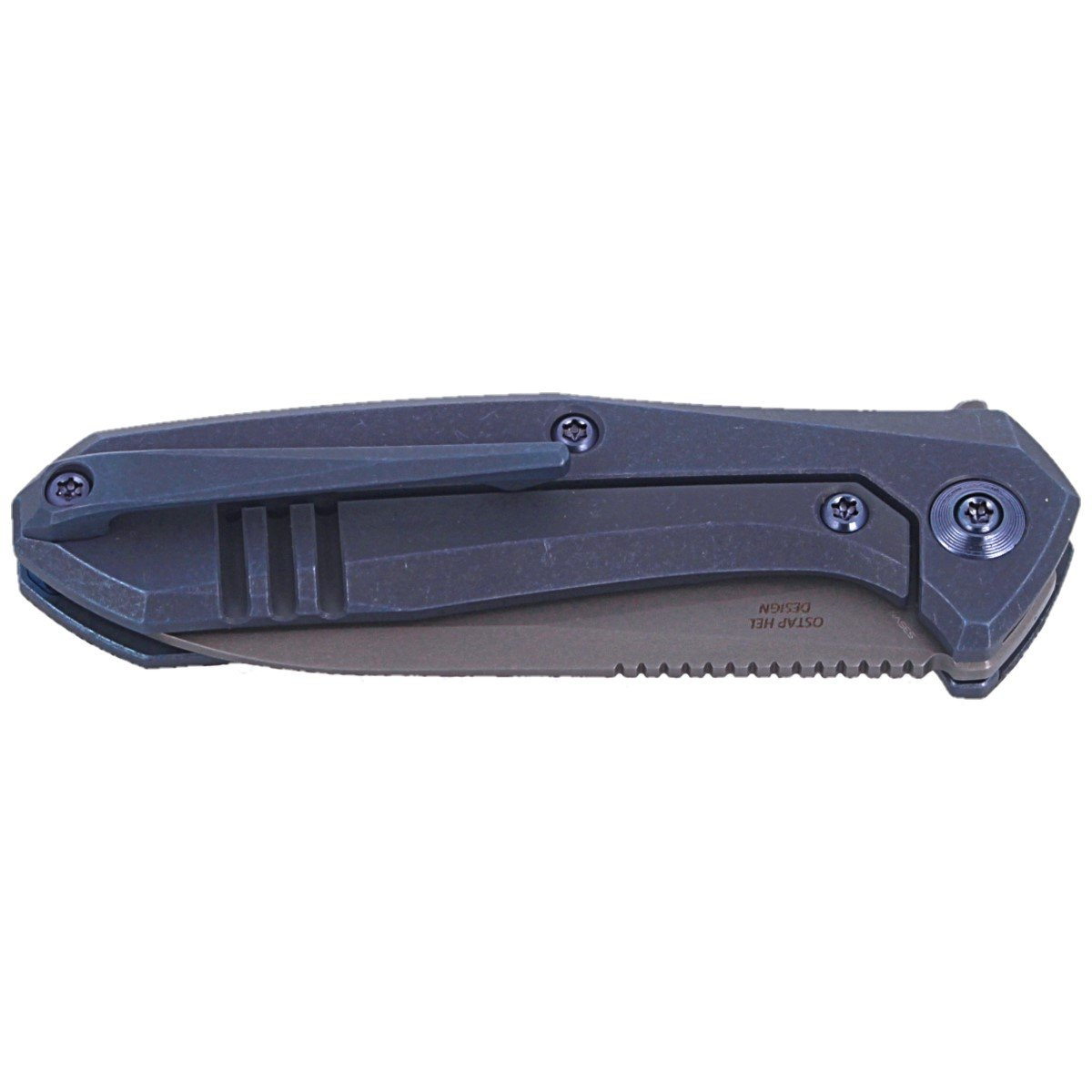 Handle - made of two solid 6AL4V titanium facings with blue finish. Both facings are connected to each other by titanium backspacer. The simplicity and solidity of this construction give assurance of many years of use. The deep carry clip, one-position (right), made of titanium, allows you to carry the knife in tip-up position. In the backspacer there is a place for attaching a safety or decorative cord. As in other models, the pivot is decorated with a stylized logo of the manufacturer.