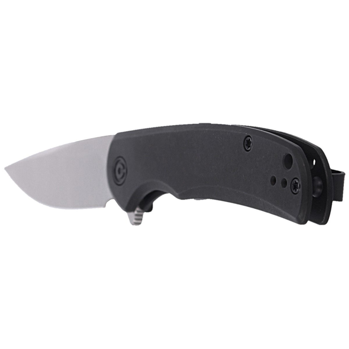 Handle - made of stainless steel finished in black, screwed together with spacer sleeves. This significantly reduces the weight of the knife. Simplicity and solidity of construction give assurance of many years of use. Deep carry clip, two-position (right/left) made of steel, allows you to carry the knife in tip-up position. In the back of the handle, above the clip, there is a lanyard hole for attaching a safety or decorative cord. As in other models, the pivot is decorated with stylized manufacturer's logo.