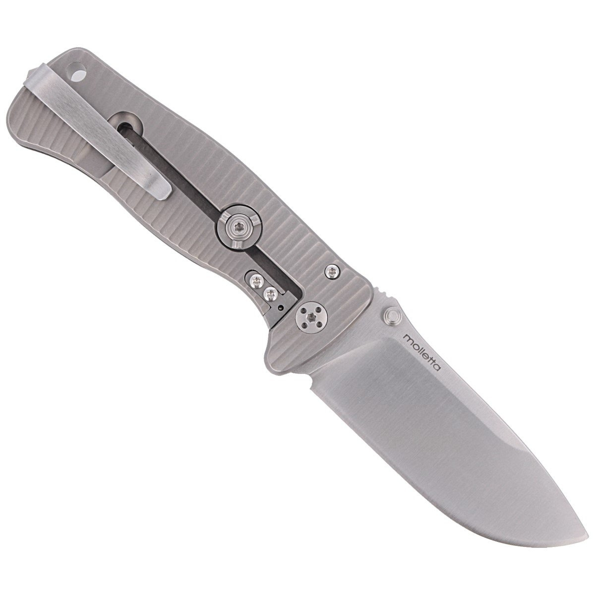 RotoLock - lock with a patented additional locking mechanism in the shape of a titanium shield by Gianni Pauletta. When the knife is open, turning the RotoLock about 1/8 of a turn clockwise wedges the lock mechanism, preventing unintentional release of the blade lock, providing the same stability of the blade as in knives with a fixed blade.