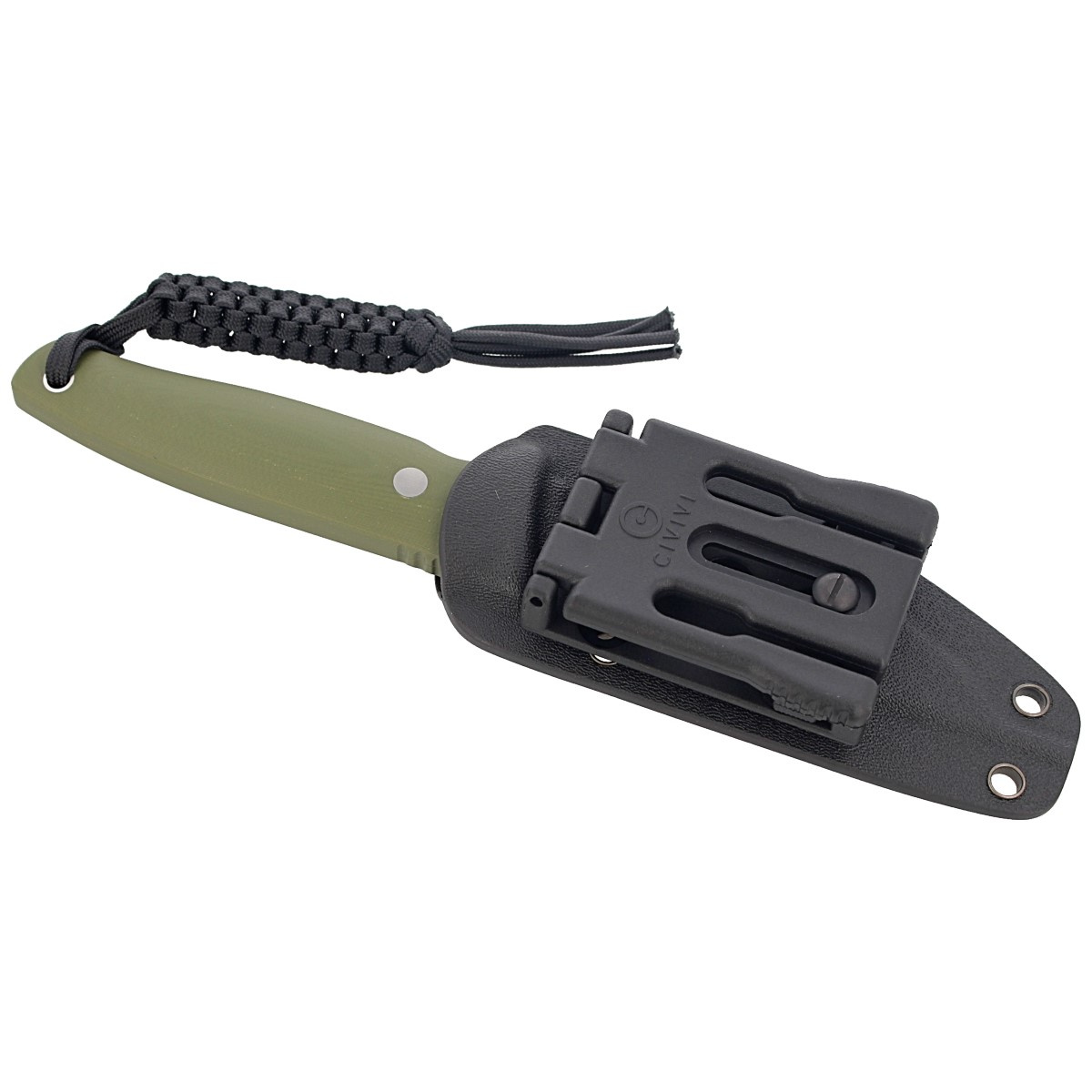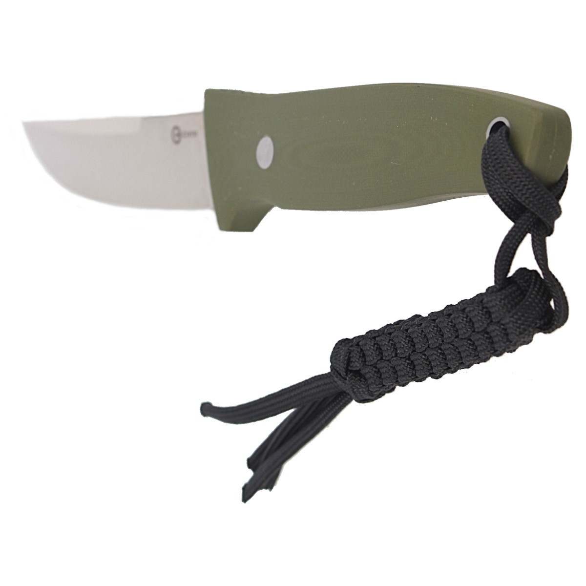 Handle - non-slip textured G10 green composite grip, attached to the tang with pins. Simple, solid construction guarantees many years of use. The set includes black kydex sheath, which thanks to Tek-Lok clip can be mounted to the belt or equipment. The pin at the back of the handle creates lanyard hole, which is a hole for threading safety or decorative cord (included).