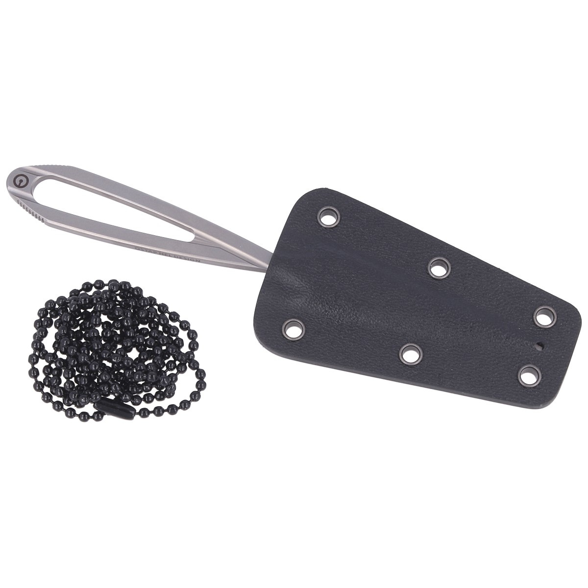The set includes black kydex sheath which can be worn around the neck with included chain. Thanks to holes at the edges of the scabbard you can also strap the knife to your equipment with paracord or Tek-Lok.