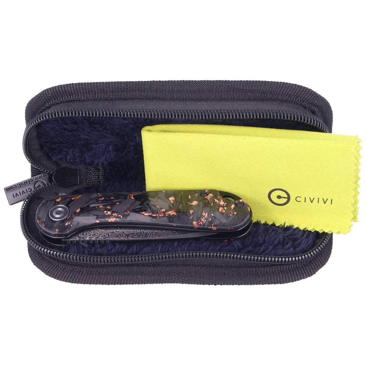 The handle is a unique 3D pattern of the black Carbon Fiber and copper pieces embedded in transparent resin, which were screwed to the steel frame of the knife. The open-backed design without the typical backspacer, fastened together with steel spacer sleeves for easy cleaning. The pivot is decorated with a stylized Civivi brand logo. Right-side metal deep carry clip allows you to carry the knife discreetly in your pocket in tip-up (blade up) position. Above the clip is a lanyard hole, an oval opening for a cord.