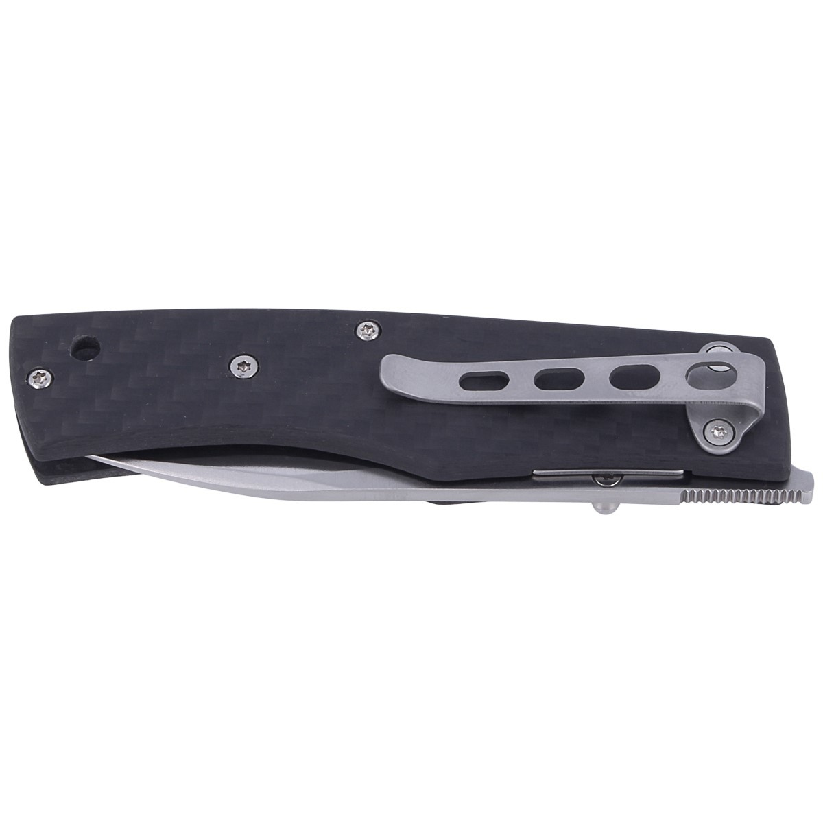 Two pieces of solid Carbon Fiber (carbon fiber pressed under pressure with synthetic resin) in black. Chamfered edges and fine texture improve grip security. Open-backed construction with steel bushings reduces weight and facilitates cleaning. The stylized pivot adds a distinctive touch to the handle. The right-side clip allows the knife to be carried in tip-down position with the tip of the blade down. The back of the handle features a lanyard hole, a hole for attaching a safety or decorative cord.