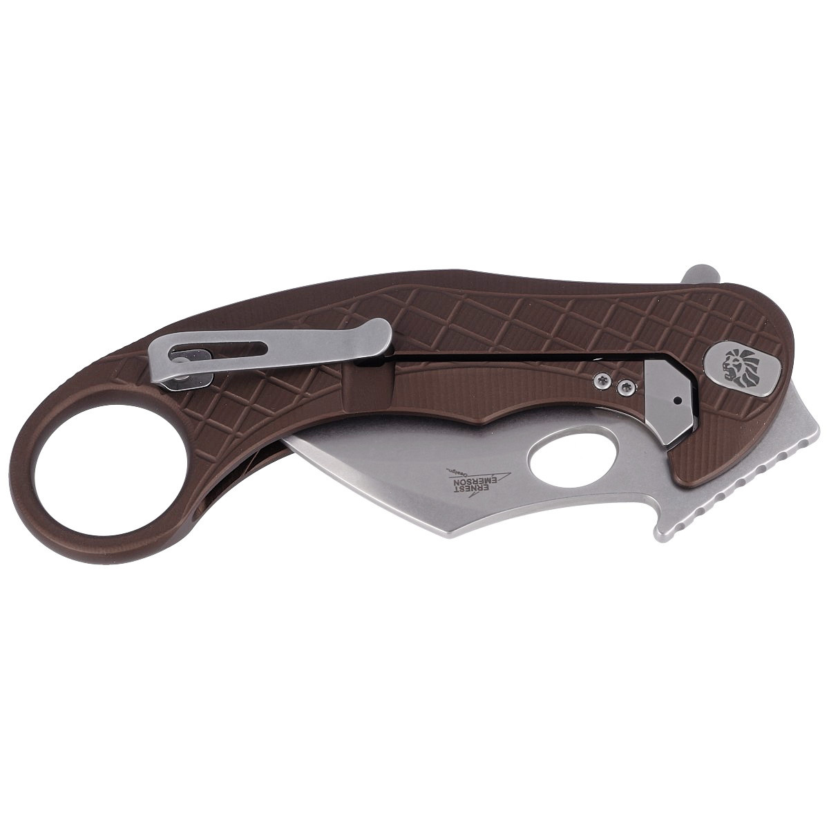 - L.E.One Karambit Brown Aluminium, Stone Washed MagnaCut the most technically advanced folding karambit in the world! CPM MagnaCut steel, Ergal aluminum in aged bronze. Lionsteel's patented technologies and unique Emerson Design.
