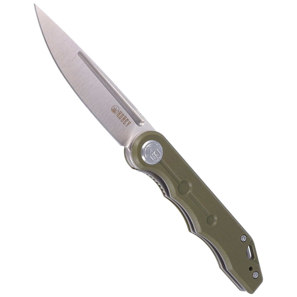 Handle - green G10 (pressure-pressed fiberglass with synthetic resin) facings,textured for improved grip security, bolted to the knife's steel frame. The so-called open-backed design without the typical backspacer, fastened together with steel spacers for easy cleaning. The simple, solid construction gives you the assurance of many years of use. Fore finger groove improves grip security. The pivot axis is decorated with a stylized manufacturer's logo. A two-position (right and left) metal deep carry clip allows you to carry the knife discreetly in your pocket in tip-up position (blade tip up). Above the clip a lanyard hole, a hole for threading a safety or decorative cord.