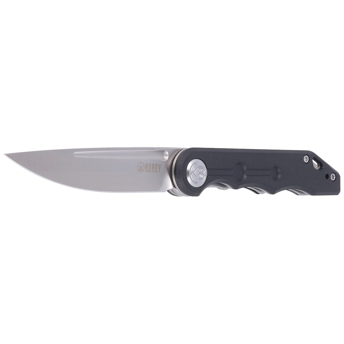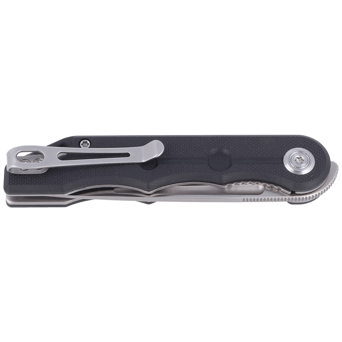 Handle - black G10 (pressure-pressed fiberglass with synthetic resin) facings,textured for improved grip security, bolted to the knife's steel frame. The so-called open-backed design without the typical backspacer, fastened together with steel spacers for easy cleaning. The simple, solid construction gives you the assurance of many years of use. Fore finger groove improves grip security. The pivot axis is decorated with a stylized manufacturer's logo. A two-position (right and left) metal deep carry clip allows you to carry the knife discreetly in your pocket in tip-up position (blade tip up). Above the clip a lanyard hole, a hole for threading a safety or decorative cord.