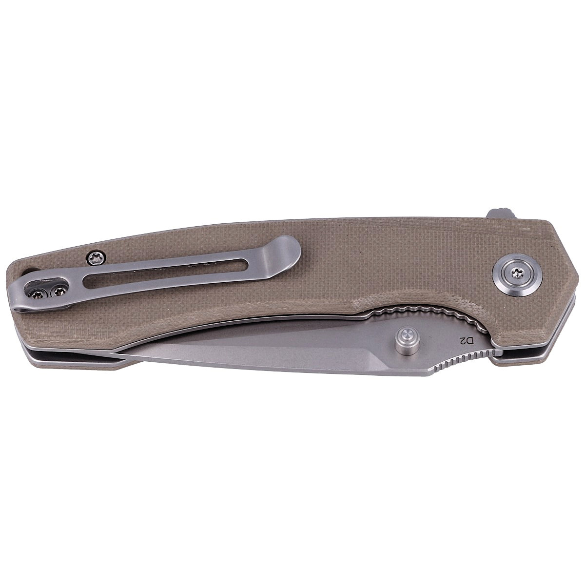 Calyce, Tan G10, Bead Blasted D2 handy, powerful EDC knife. Drop point blade made of D2 steel,, fast Flipper flipper or double-sided opening pin and G10 handle. Excellent value for money! Bestseller!
